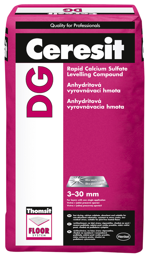 DG je anhydritová samonivelizačná podlahová hmota na hrúbku vrstvy 3 – 30mm v jednej pracovnej operácii. Ceresit DG je určená na vyrovnanie vodorovných betónových podláh, cementových a anhydritových poterov (vr. poterov s podlahovým vykurovaním), magnezitových poterov, podkladov z liateho asfaltu,dlažby, kameňa a pod. Slúži ako podklad pred kladením podlahových krytín. Určená na použitie v interiéri v suchých priestoroch. Nepoužívajte na tvorbu poterov a finálnych podláh.